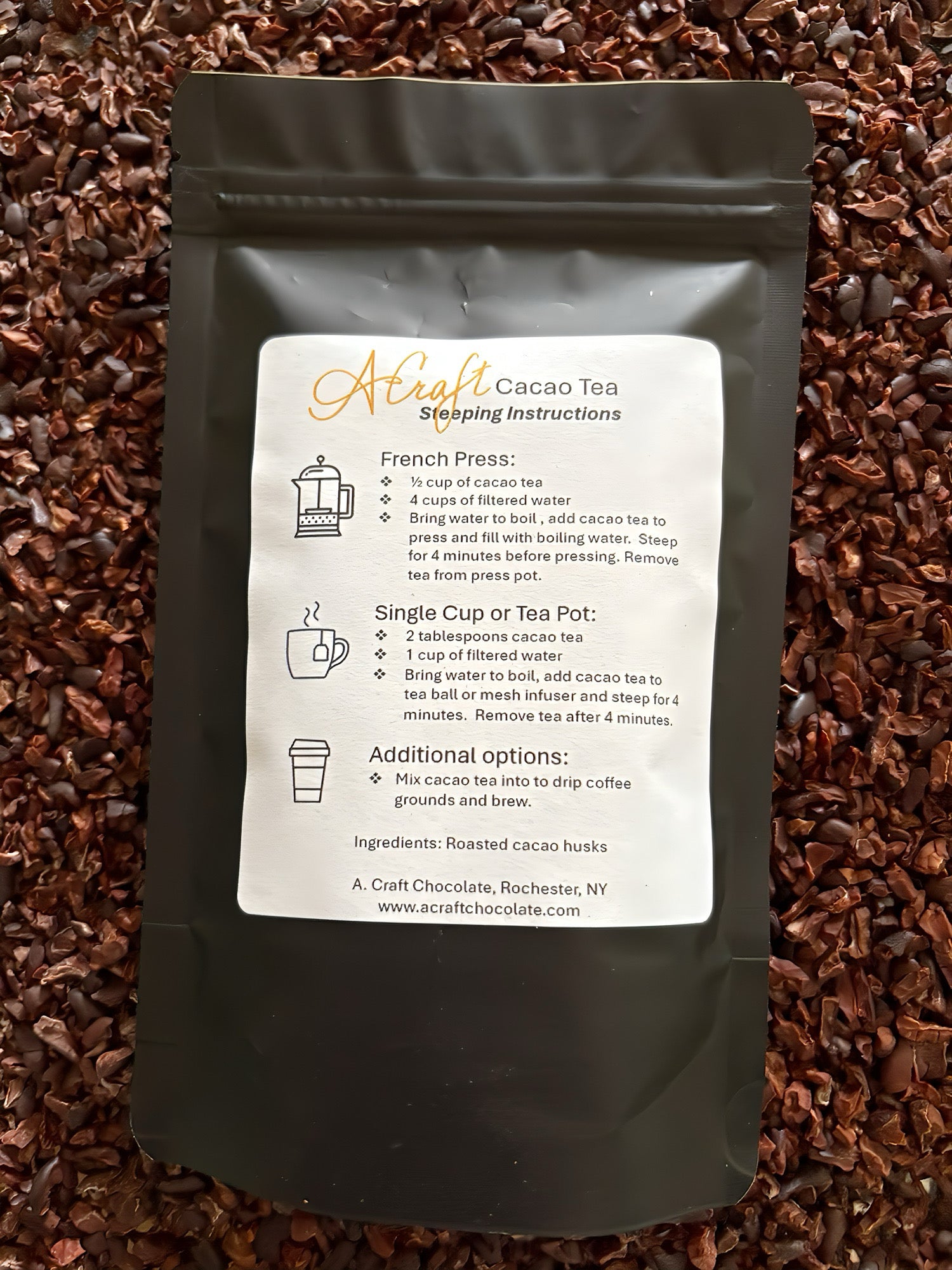 All of the health benefits of cacao, no sugar. Many people also add these husks to their morning coffee grounds for the added benefits and flavor the cacao husks provide.